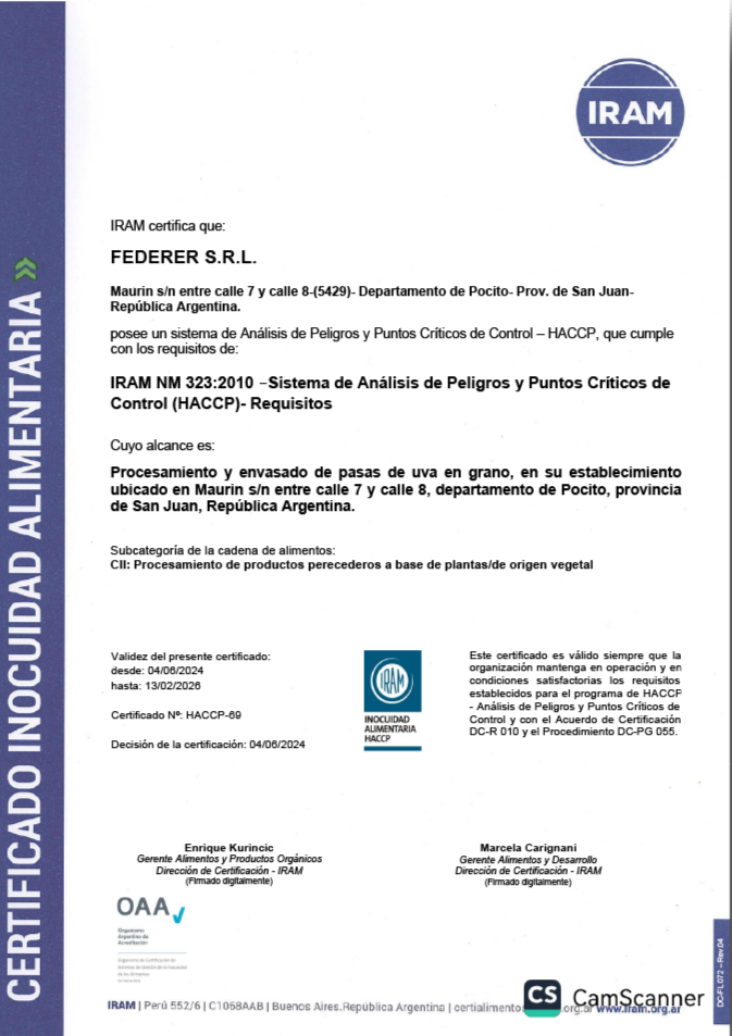 CERTIFICACIÓN Estamos certificados bajo normas IRAM HACCP y FOOD SAFETY SYSTEM CERTIFICATION (FSSC) 22000, y con SELLO ALIMENTOS ARGENTINOS que garantizan la calidad e inocuidad de nuestros productos. Esto nos permite estar a la altura de las exigencias y los estándares del mercado internacional.